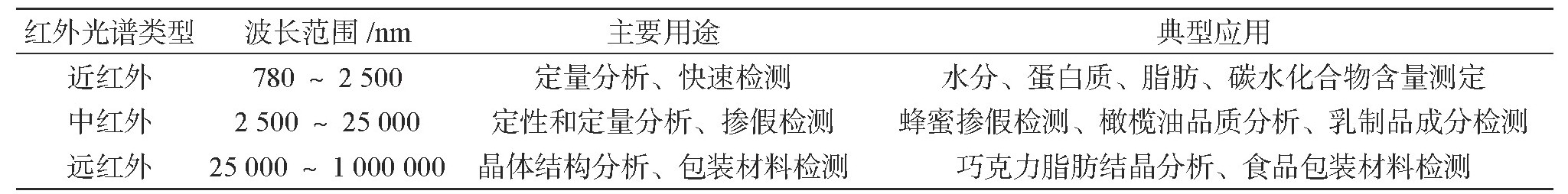 食品安全关乎人们的身体健康,是公众关注的焦点。尽管传统的食品检测方法(如色谱法、质谱法等)具有较高的精度和可靠性,但存在分析周期长、成本高、样品处理复杂等问题,难以满足现代食品安全快速检测的需求[1]。红外光谱技术是一种基于物质分子振动与红外光相互作用的分析方法,能够提供食品样品的分子结构信息,具有分析速度快、无损检测、环保等优势[2]。根据光谱范围的不同,红外光谱可分为近红外光谱和中红外光谱。近红外光谱适用于快速、无损的食品宏观成分分析,如水分、蛋白质、脂肪和碳水化合物含量测定;中红外光谱能够提供更丰富的分子特征信息,适用于食品品质控制、掺假鉴别及食品安全检测等领域[3]。近年来,红外光谱技术在食品检测中的应用不断拓展,不仅可用于食品主要营养成分的分析,还可应用于食品掺假检测、腐败变质监测以及食品添加剂与污染物的鉴别,极大提升了食品安全检测的效率和准确性。本文对红外光谱技术检测技术进行概述,在此基础上探究其在食品检测中的具体应用方法。