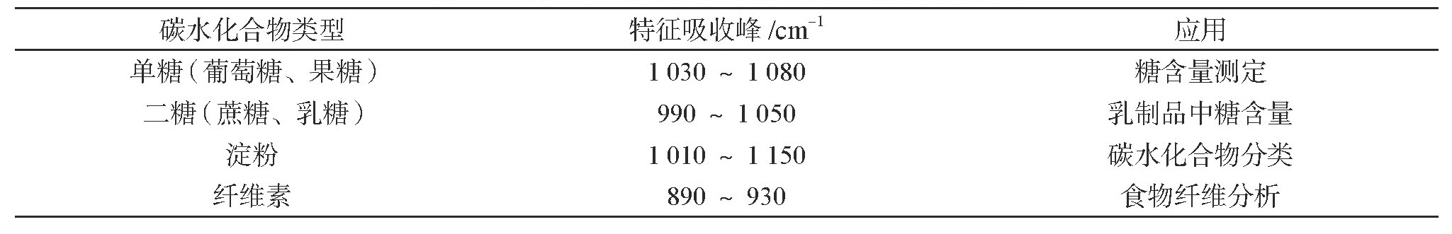 碳水化合物(如单糖、二糖和多糖)在1 000~1 200 cm-1处具有特征的C-O伸缩振动吸收峰。此外,不同糖类的环结构和糖苷键振动在900~950 cm-1也可提供分子信息。表5为不同碳水化合物类型对应的特征吸收峰及应用。