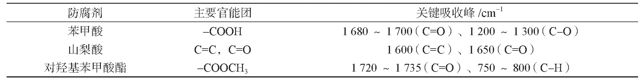 食品防腐剂主要用于延长食品的保质期,但过量使用或非法添加可能会对人体健康造成危害[8]。常见的防腐剂包括苯甲酸、山梨酸及其盐类,这些化合物在红外光谱中具有特定的吸收峰,可用于快速定性和定量检测。通过FTIR分析,可利用这些特征吸收峰区分不同防腐剂,并结合化学计量学方法进行定量分析。表6为不同防腐剂主要官能团及关键吸收峰。