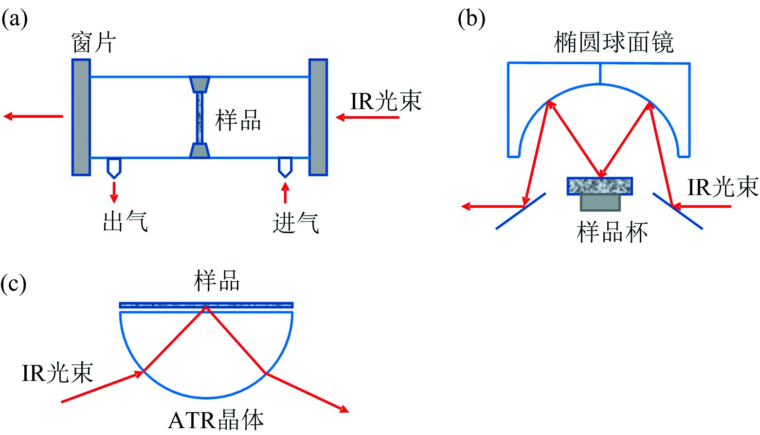(a): 透射; (b): 漫反射; (c): 衰减全反射