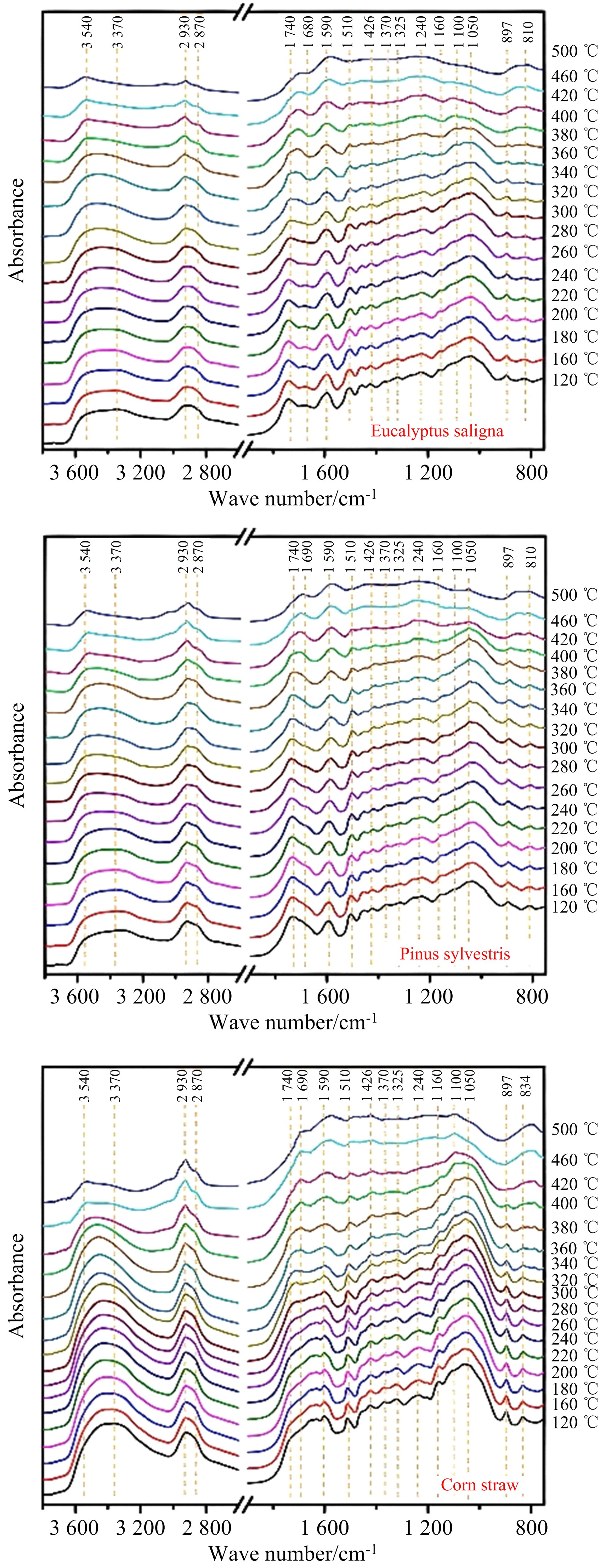 Fig.2 In-situ DRIFT spectra of eucalyptus saligna, pinussylvestris and corn straw at different pyrolysis temperatures