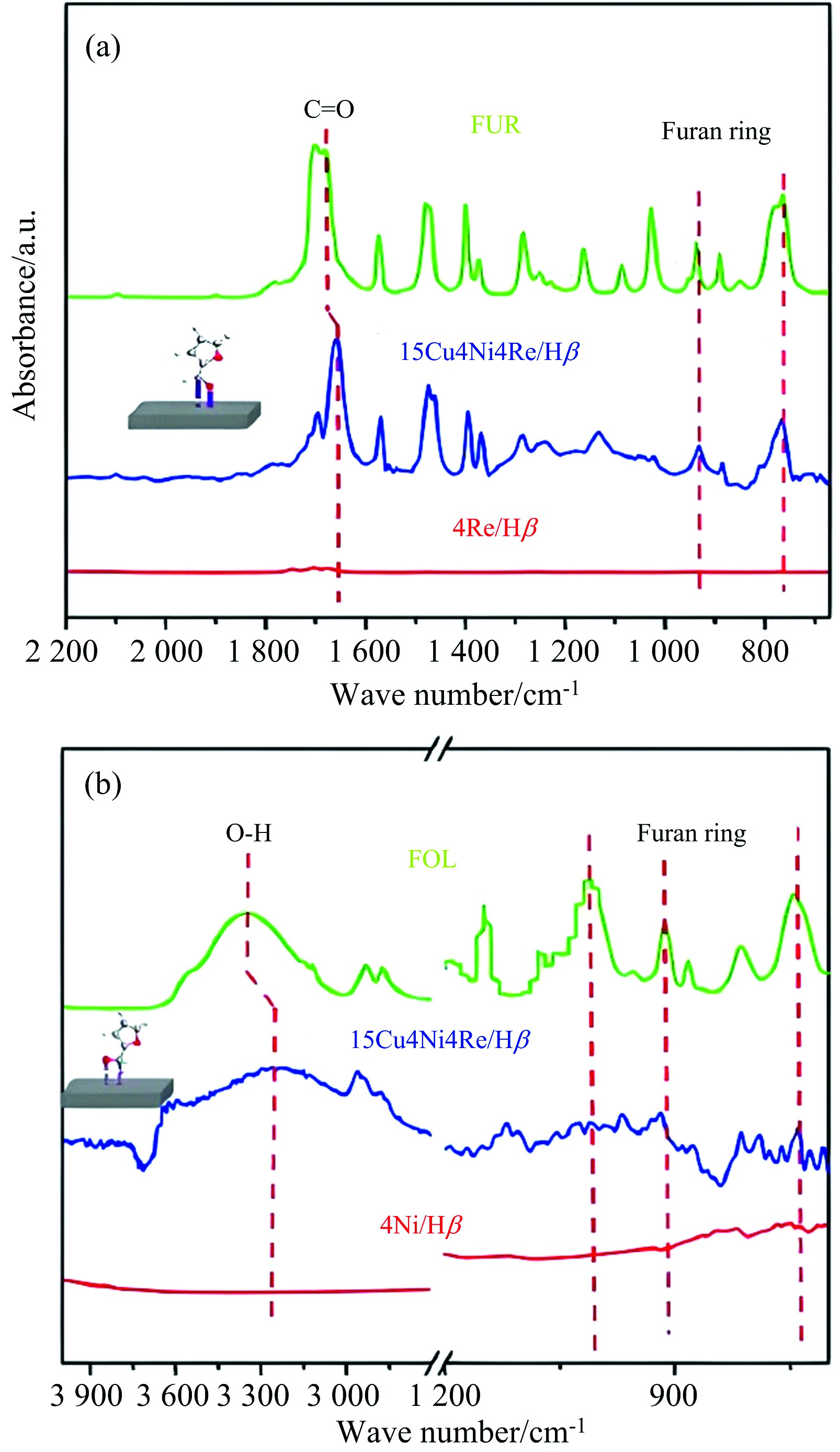 图5 在15Cu4Ni4Re/Hβ催化剂上吸附FUR和FOL的原位FTIR-ATR谱图[63]