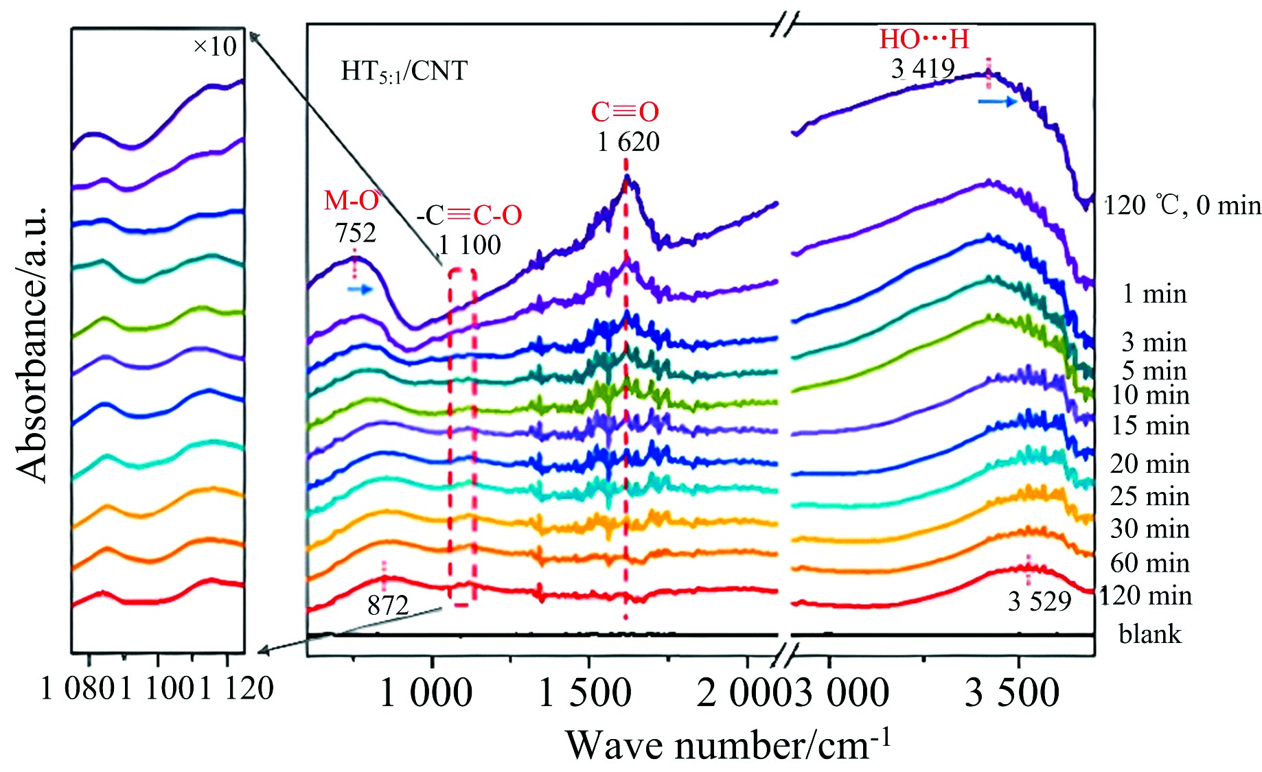 Fig.6 In-situ FTIR spectra during glucose reaction with HT/CNT at 120 ℃ with prolonged time