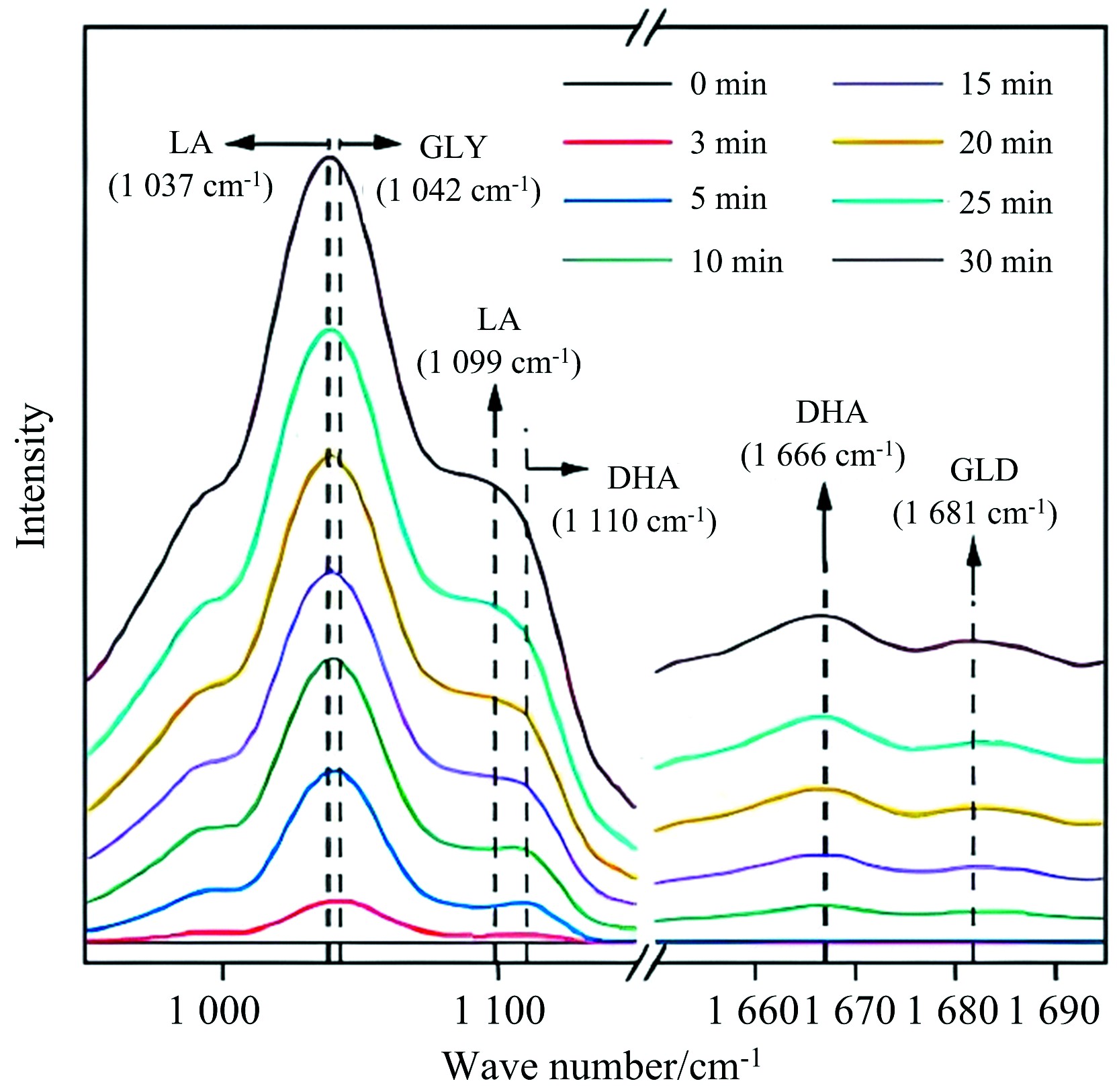 电催化氧化具有许多突出的优点, 如不需要化学氧化剂、 反应条件温和、 活性和选择性可控[76]。 Yan等开发了一种电催化策略, 通过在中等电位下使用氢氧化镍负载的金电催化剂(Au/Ni(OH)2), 实现了高电流密度下甘油和乙二醇分别升级为乳酸和乙醇酸的高选择性。 采用原位FTIR的电化学方法研究了Au/Ni(OH)2上甘油-乳酸的反应途径, 如图7所示, 反应3 min后观察到二羟基丙酮的信号(1 110和1 666 cm-1), 反应15 min后观察到低强度的甘油醛(1 680 cm-1)和乳酸(1 037和1 099 cm-1)的形成, 推断出Au/Ni(OH)2上的甘油酸转化为乳酸的过程包括甘油酸电氧化为二羟基丙酮(主要)和甘油醛(次要)[77]。 Chen等采用脉冲电位电解策略, 在铂基催化剂上将甘油选择性电催化氧化为甘油酸。 通过原位FTIR分析了甘油电氧化过程中表面微环境和吸附物种的变化, 发现与甘油氧化中间体相关的键的强度随着电势的增加和电解时间的增加而增加, 并且更高的电势会导致甘油氧化中间体的快速形成和积累。 同时发现反应过程中金属催化剂表面氢键呈增加趋势, 归因于负电荷有利于醇盐在催化剂表面的形成和吸附, 随着电势的增加, 表面OH-浓度也增加[78]。