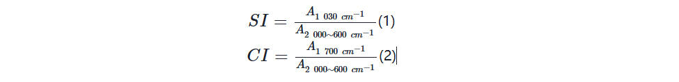 沥青路面的耐久性分析需要深入研究沥青的老化机理,FTIR试验常用于评价沥青官能团的变化,从而表征老化过程中沥青的官能团变化机制[26]。热氧老化是沥青路面在施工和服役过程中不可避免的变化现象,在沥青热氧化老化过程中,自身的羰基(波数为1 030 cm-1)、亚砜基(波数为1 700 cm-1)等含氧官能团会出现显著变化,通过计算特定官能团的变化指数如羰基指数(CI)和亚砜基指数(SI)来定量评价沥青的老化程度,如式(1)和式(2)所示,这是特定光谱范围内计算官能团指数的常用方法[27-28]。