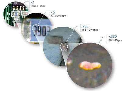 岛津特有的大视野相机和显微镜相机使样品可见观察更为高效。除了10X13mm的超大视野外,大视野相机还提供了数字变焦功能(5倍数字变焦)。而且,通过与显微镜相机共享位置信息,可以实现高达330倍的连续放大,对非常小的样品区域能直接使用30X40μm的小视野进行观察(显微镜相机本身支持10倍数字变焦)。