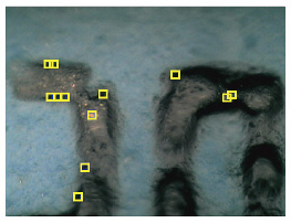 此处是电子器件端子上附着异物的分析例。利用大视野相机,观察器件整体,决定对哪个部位进行测量。对薄的污渍或小的外来异物,反射方法谱图质量不好时,可以考虑使用Ge晶体的显微ATR测量。