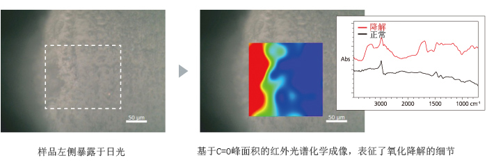 此处是长期暴露在日光下的树脂部件分析例。通过对部件截面红外光谱的测量,深度方向上的降解程度实现了可视化。