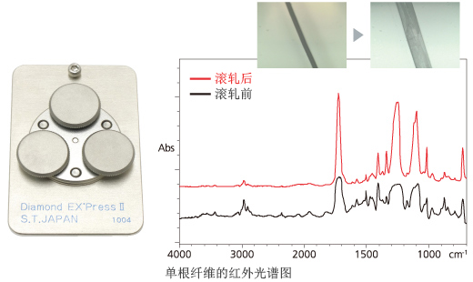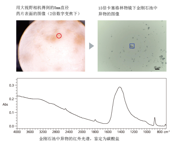 此处是附着在药片表面异物的分析例。通过挑入金刚石池中进行挤压,可以对不同形状的样品进行显微透射测量。