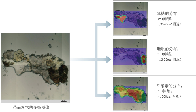 药品粉末用金刚石池滚轧后进行红外显微mapping测量。右图表示的是粉末不同成分(乳糖、脂质、纤维素)的分布情况。显示的颜色可以在单色和彩色之间自由切换。