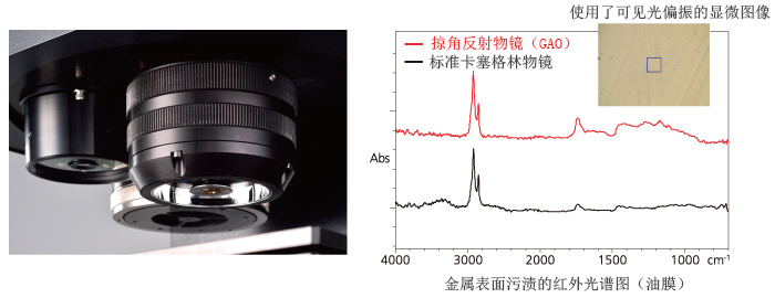 掠角反射物镜采用80度角入射,特别适用于金属基质上nm级的超薄有机膜测量。在失效分析中,GAO物镜常用于凹状表面上的样品或金属表面污渍的测量。