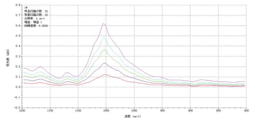 2、以各自吸收峰切线为基线,测定谱图在约1745cm -1 、1709cm -1 和1052cm -1 处最大吸收峰的吸光度,将得到的吸光度值代入工作曲线,求出样品中各成分的含量。