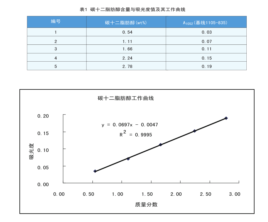 利用铝箔轧制油添加剂中各成分在红外区不同波数具有各自的特征吸收峰(如:醇在1052cm -1 有特征吸收,酸和酯则分别1709cm -1 、1743cm -1 处有特征吸收),将系列标准物质用基础油(碳链为C12~C16的煤油基润滑油)按一定比例稀释成标准溶液,根据朗伯-比尔定律,随浓度的增加各溶质浓度与其吸光度成线性关系。将测试样品的各特征吸收峰的吸光度代入线性关系式,便可得知样品各成分的浓度。