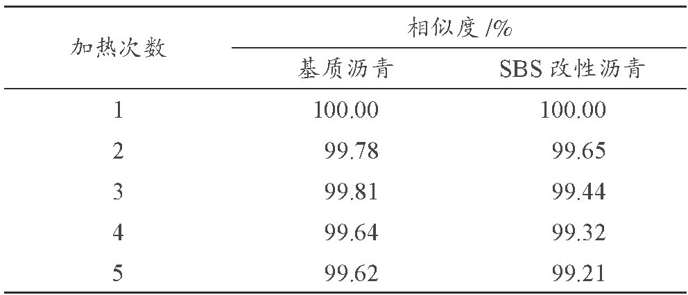 由表2可知,对基质沥青与SBS改性沥青进行多次加热循环后,其相似度指标展现出了较高的稳定性,即便加热次数增至5次或以上,两者的相似度依然维持在99%以上的高水平。综上所述,在温度条件不变的情况下,加热次数的变化对基质沥青与SBS改性沥青两者相似度的影响并不显著。